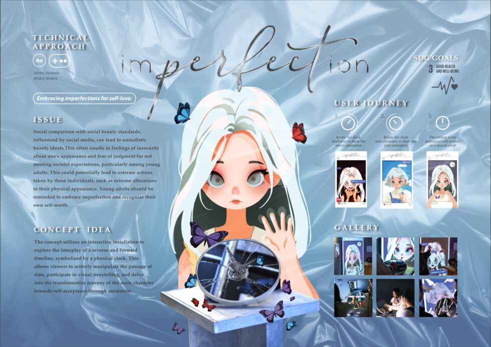 “imPERFECTion” is an interactive installation addressing the impact of social media-driven beauty standards and the resulting insecurities, especially among young adults. Using a physical clock to symbolize time, participants rotate it to view past and future animations that depict the main character’s journey toward self-acceptance. The project encourages embracing imperfections and promotes self-worth through engaging visuals and storytelling.